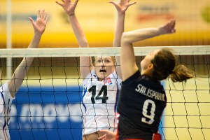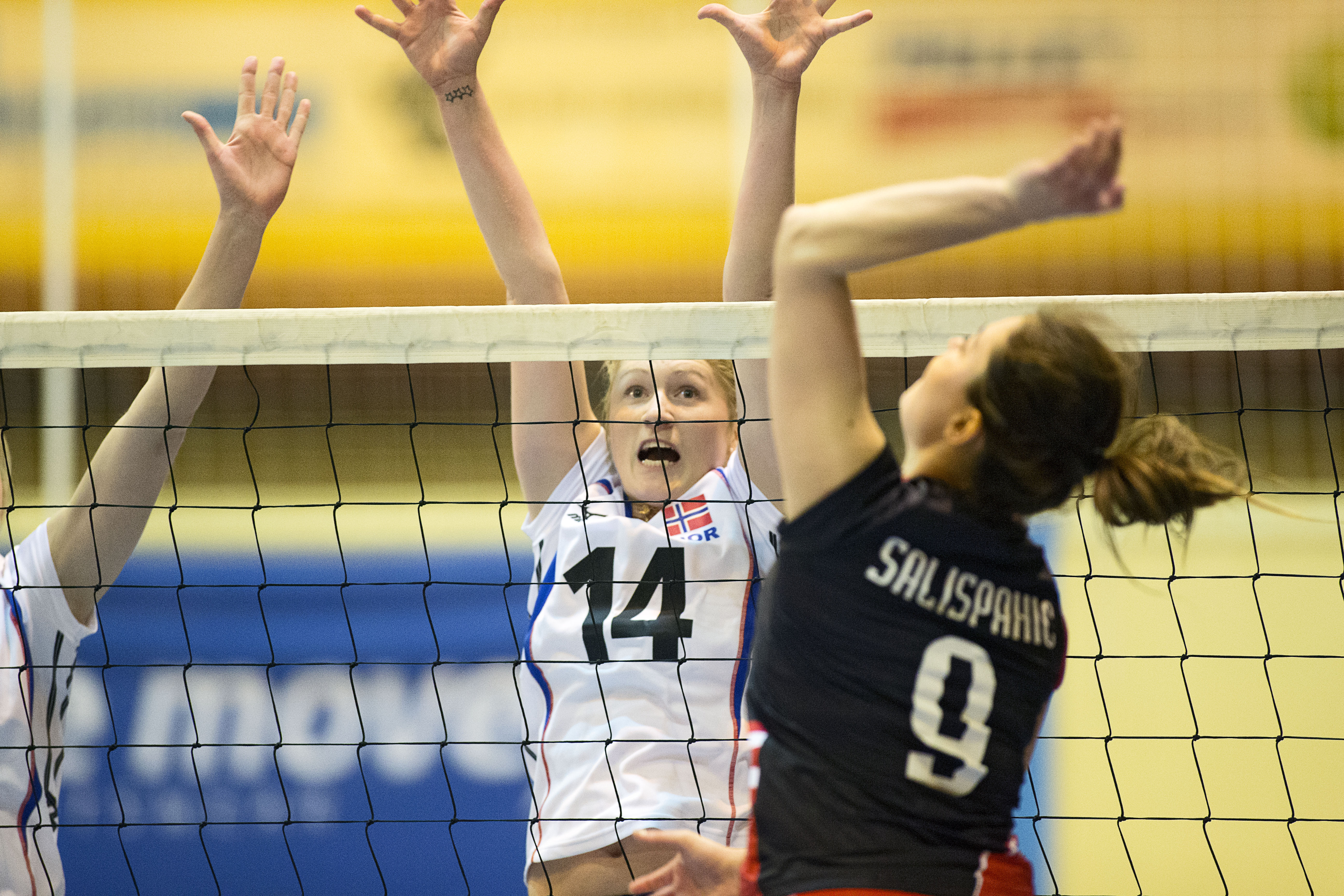 Mari Aase Hole i blokk 03/05/2014 / volleytomm Norge – Danmark 3-0 (25-22, 25-13, 25-19). Landskamp i Slagenhallen 3. mai 2014.