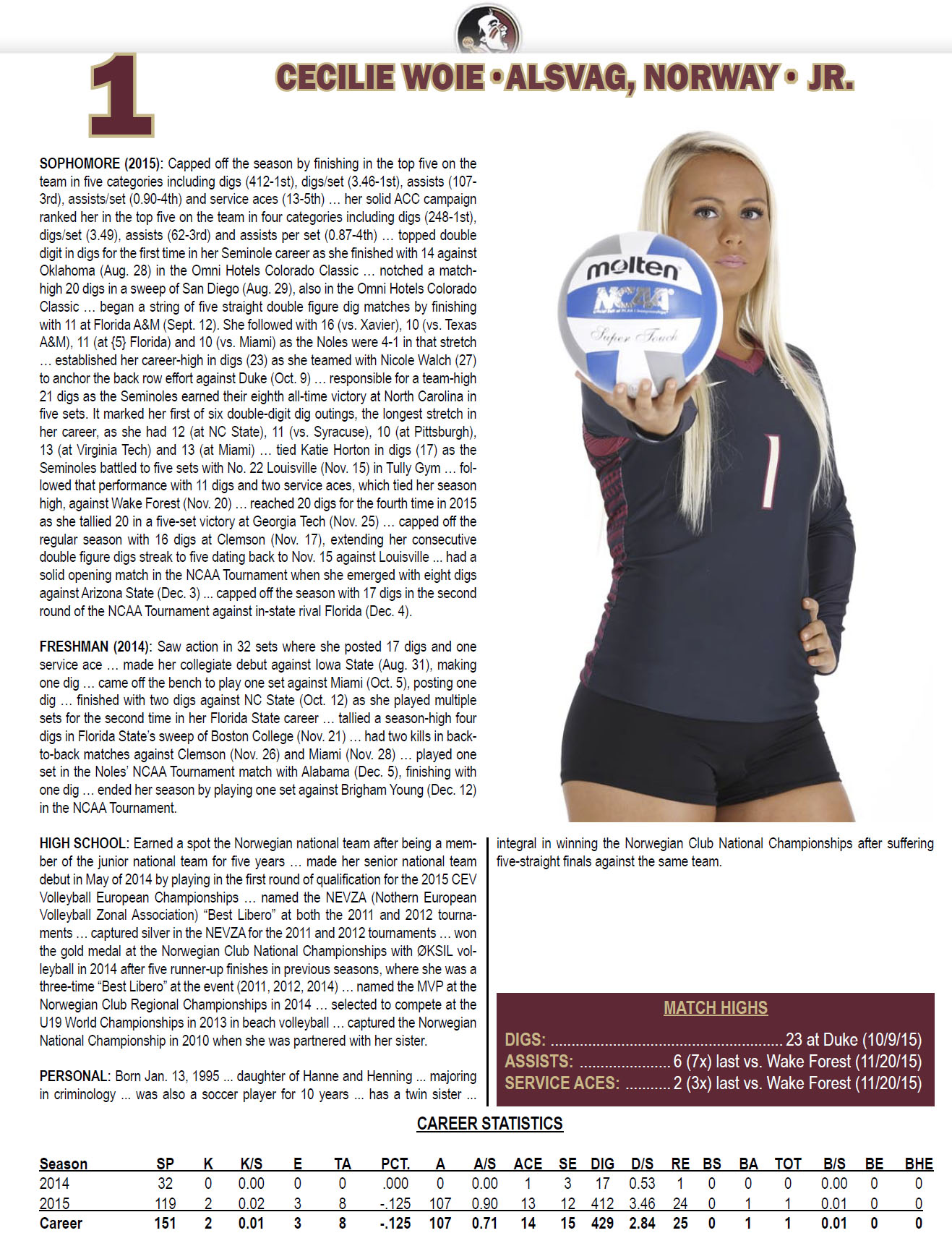 Cecilie Woie fra Øksnes forteller litt om sine opplevelser i USA denne høsten på The SpikeNet. Florida State er nå rangert som nummer 15 i NCAA så det går litt oppover siden sesongstart (7 seire, 2 tap hittil i sesongen). Den siste tiden har det blitt lite tid til blogging for 21-åringen som sier hun har lagt om serven før denne sesongen (libero server i USA). Woie debuterte på banen i USA 31. august 2014 og er nå Junior (student på 3. året). Hun rakk å spille sin første seniorlandskamp for Norge i mai samme år. Cecilie er tvilling med Lisbeth Woie som også er landslagsaktuell her hjemme og tok «the double» med Randaberg forrige sesong.